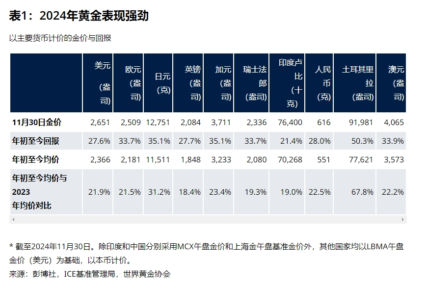 今年迄今為止,以美元計(jì)價(jià)的金價(jià)漲幅超過28%,年平均交易價(jià)格較2023年高出22%;其他貨幣金價(jià)表現(xiàn)同樣強(qiáng)勁(表1)。今年黃金已40次打破歷史記錄,三季度黃金需求總量首次超過了1,000億美元。