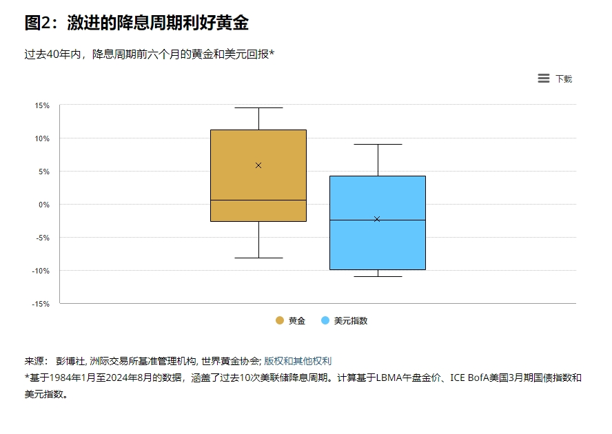 歷史數(shù)據(jù)表明,在降息周期開始的前六個(gè)月,金價(jià)平均漲幅為6%。而隨后黃金的表現(xiàn)則受到降息周期的持續(xù)時(shí)間和深度影響(圖2)。