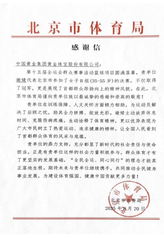賽事圓滿落幕后,中金珠寶收到了來自北京市體育局的感謝信。信中對謝婧同志“展現了首都群眾昂揚向上的精神風貌”給予高度贊揚,并特別感謝中金珠寶在“訓練保障、人文關懷方面傾力相助,為運動員解決了后顧之憂”。這份來自賽事主辦方的認可,既是對謝婧個人拼搏精神的肯定,也是對中金珠寶團隊支持保障工作的充分贊譽;不僅展現了新時代央企職工的綜合素質,更體現了中金珠寶倡導的團結協作、共創價值的良好氛圍。