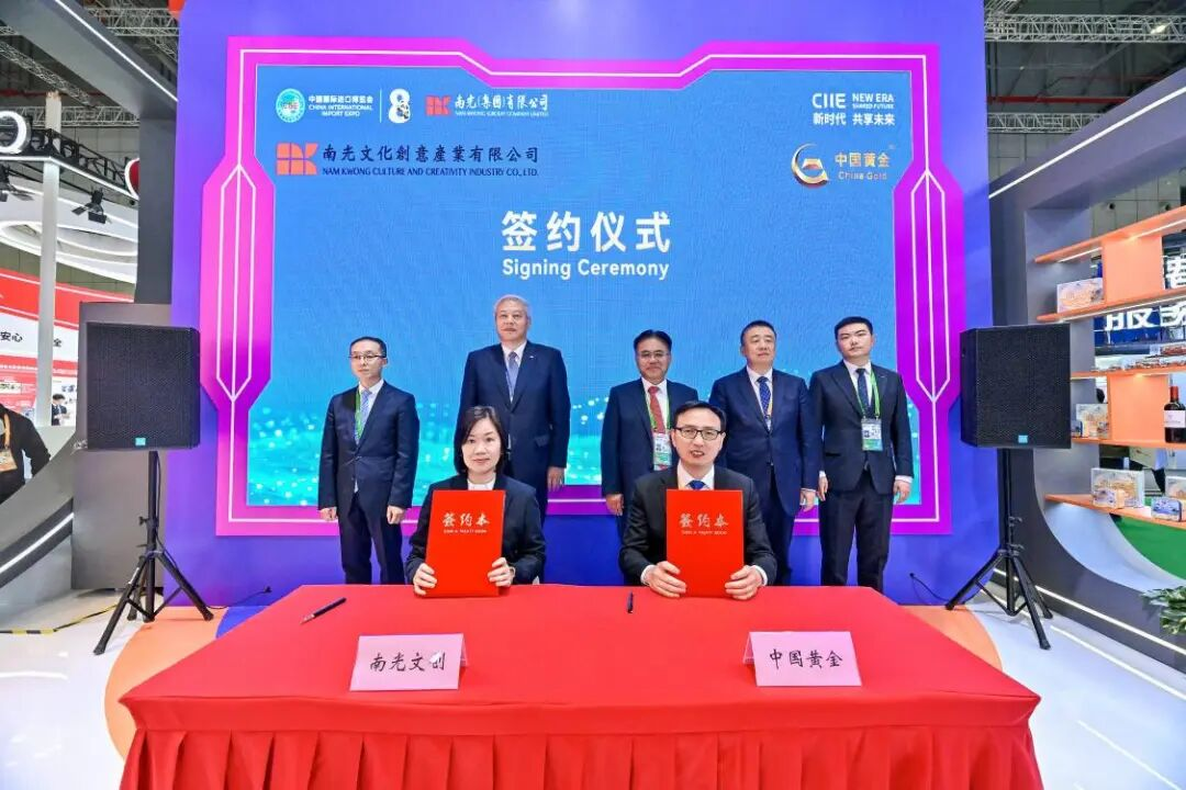 11月6日上午,周洲前往進博會南光(集團)有限公司展區,與南光集團董事長傅建國共同出席中金珠寶與南光文創戰略合作協議簽約儀式。根據戰略合作協議,雙方將圍繞粵港澳大灣區及海外市場開拓、文化創意與體育賽事合作等領域開展深度合作,攜手打造央企業務協同與創新發展的新典范。